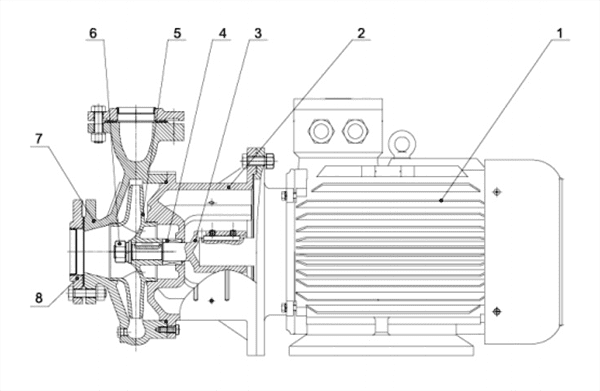 - Насос центробежный с единственным рабочим колесом с осевым всасывающим патрубком и радиальным напорным патрубком