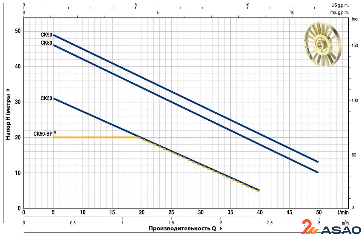 Серия СК включает в себя самовсасывающие жидкостно-кольцевые электронасосы. Рабочее колесо, которое имеет многочисленные радиальные лопатки, помещено внутри корпуса насоса, в котором имеются впускные зазоры всасывающих и нагнетающих каналов; опора закрывает корпус насоса с задней стороны. Таким образом лопатки рабочего колеса оказываются заключенными между двумя тщательно обработанными стенками корпуса насоса. В процессе функционирования рабочее колесо обеспечивает центробежное движение воды по направлению к периферии; вода приобретает энергию и создает тем самым жидкостное кольцо, вращающееся вместе с самим рабочим колесом. Каждый сектор, заключенный между двумя смежными радиальными лопатками, выполняет накачивание, создавая разряжение и давление соответственно в каналах всасывания и нагнетания, в процессе быстрого прохождения впускных зазоров специального профиля. При первом запуске достаточно заполнить водой корпус насоса, после чего образуется жидкостное кольцо и, как следствие, создается разрежение, необходимое для самовсасывания. Воздух, присутствующий во всасывающем трубопроводе, выталкивается на этапе нагнетания; образовавшийся таким образом вакуум приведет к подъему уровня воды во всасывающем трубопроводе, вызывая тем самым самовсасывание.